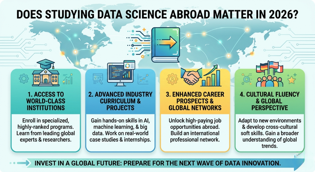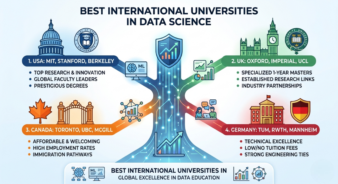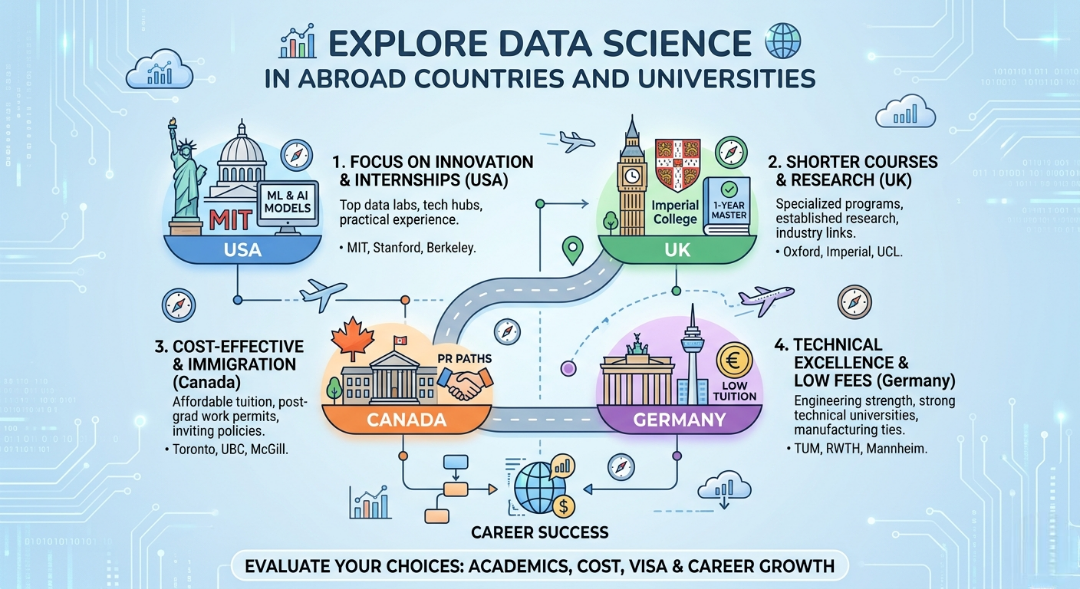 Study Data Science abroad has transformed to be one of the most intelligent choices by Indian students in 2026. As industries are transitioning into data-driven decision-making, there is an increasing demand of data professionals in the world. The USA, UK, Canada, and Germany are some of the countries which are providing the world with education, brilliant research opportunities, and high-quality career prospects.