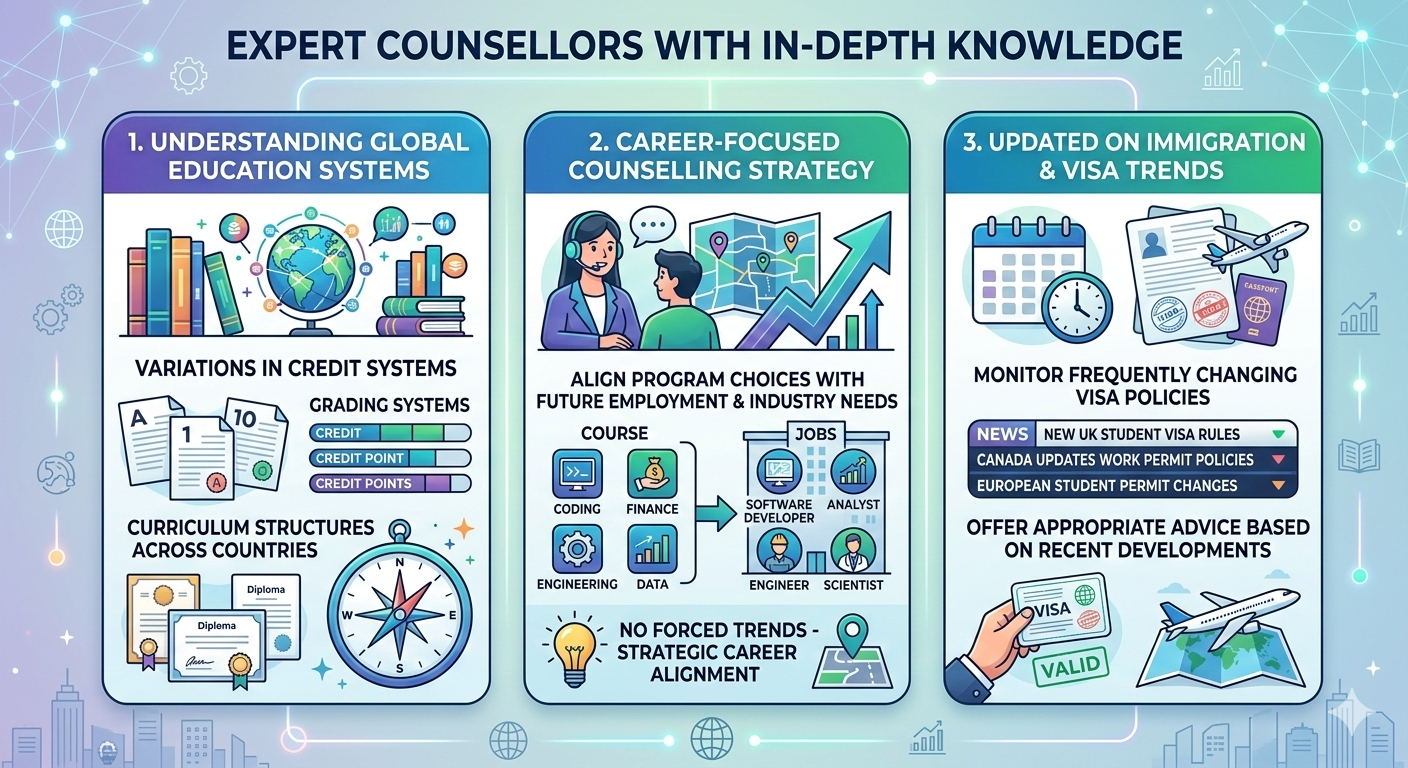 - Knowing the education systems in other countries: Professional expert counsellors need to have a clear understanding of the variations in credit systems, grading systems, and curriculum structures across different countries.