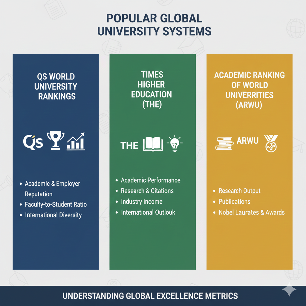 - Times Higher Education (THE): Academic, scholarship, reference, revenues of sectors, and future global.