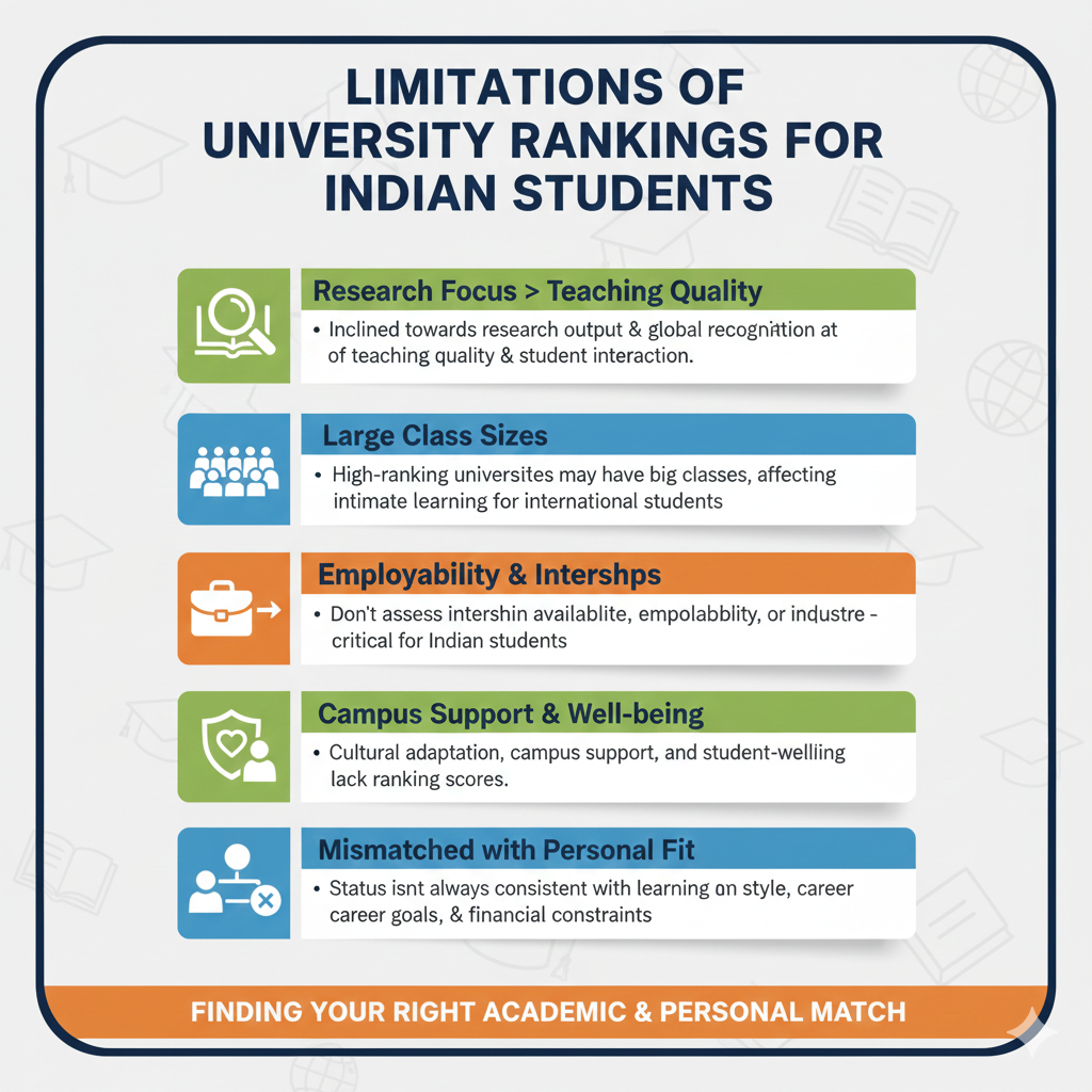 Even though university rankings create an impression of reputation, they have grave drawbacks for Indian students who are career-focused and long-term success-oriented. Using rankings will lead to misattributing results to matching expectations and missed opportunities.