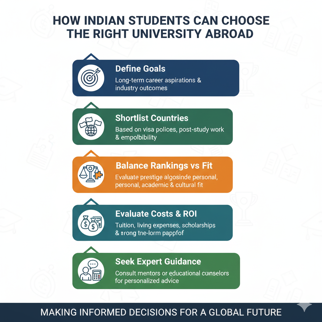 In a systematic, goal-oriented approach, where Indian students focus on choosing the right university abroad rather than relying solely on rankings as the sole determinant, the choice-making process becomes much easier.