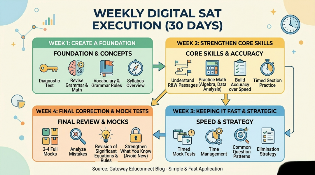 It is not out of the reach to achieve the milestone of Cracking the Digital SAT in Just 30 Days. It is about the correct attitude, strategized learning, and good intentions. Students planning for SAT can effectively prepare and succeed by following a SAT study plan for studying 1 month, acquainting themselves with the digital SAT syllabus, and utilizing the best SAT preparation tips 2026. Smart study, adequate practice through high quality mock tests, and continuous improvement would pave the way. While pondering on how to score high in SAT, Gateway Educonnect is always there to guide you and make your dream of securing seats in the leading international universities a reality. For more assistance please visit us study abroad consultancy, and avail of our wide range of services for students on destinations like study in USA, study in UK, study in Canada, study in Australia, study in ireland and many more country.