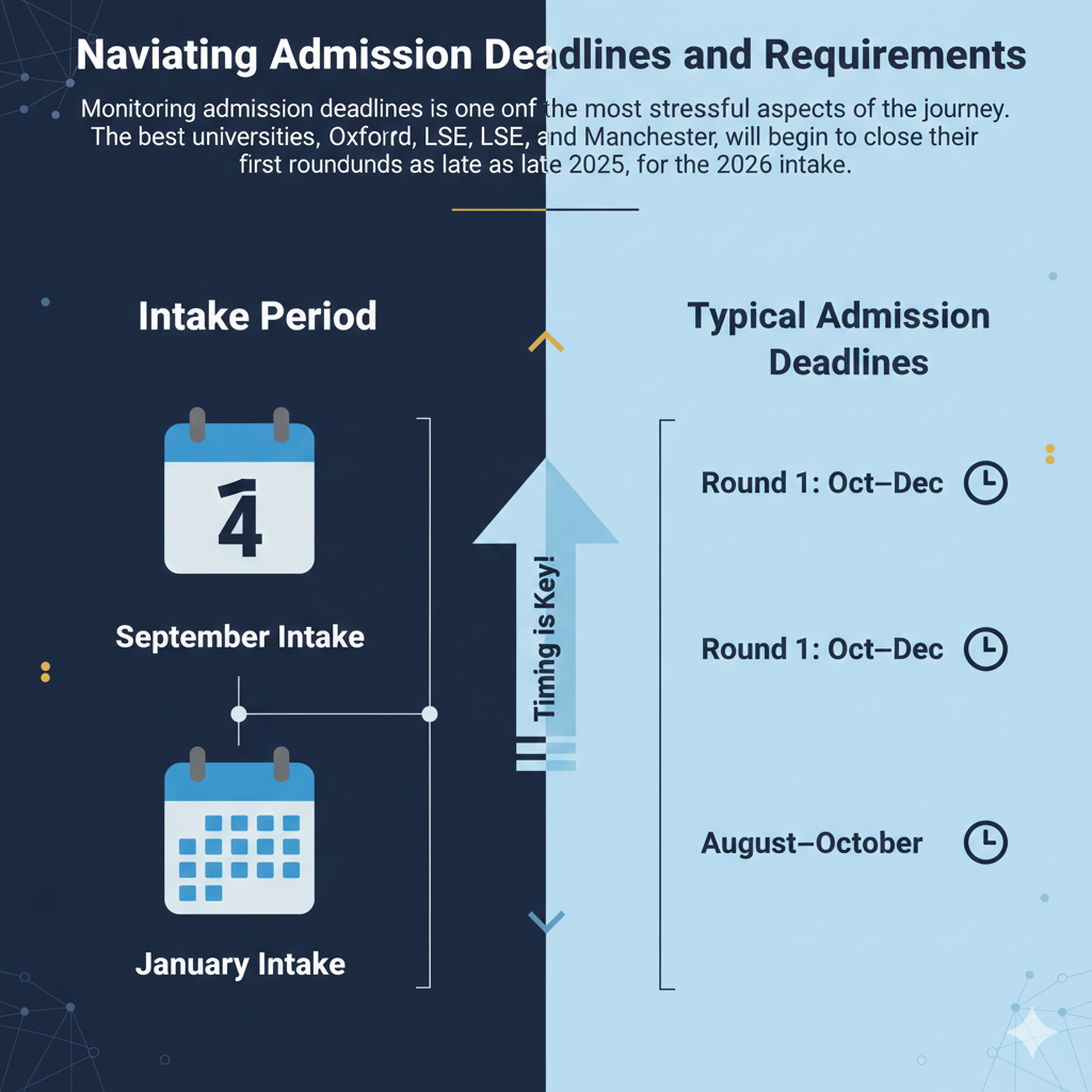 Monitoring admission deadlines is one of the most stressful aspects of the journey. The best universities, such as Oxford, LSE, and Manchester, will begin to close their first rounds as late as late 2025, for the 2026 intake.