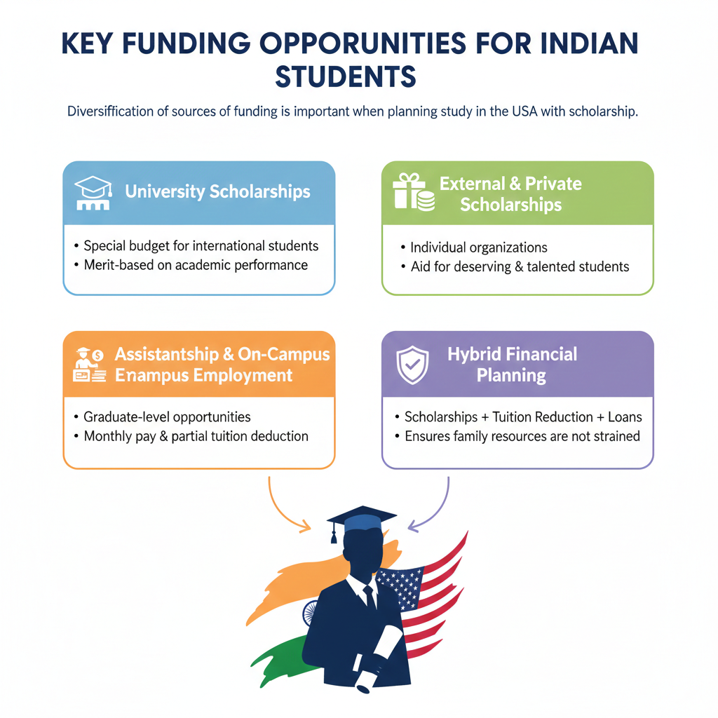 Diversification of sources of funding is important when one is planning study in USA with scholarship for Indian students.