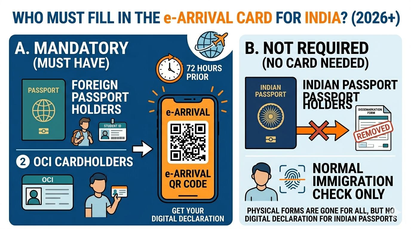 No, the Indian passport holder is not to fill in India e-arrival card 2026. This requirement applies to foreigners (those who have OCI cards as well as international students).