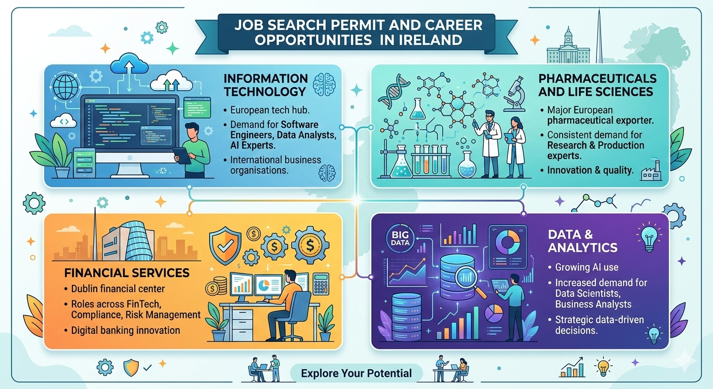 - Information Technology: Ireland has become the European hub of technology, with international business organisations actively seeking software engineers, data analysts, and AI experts.