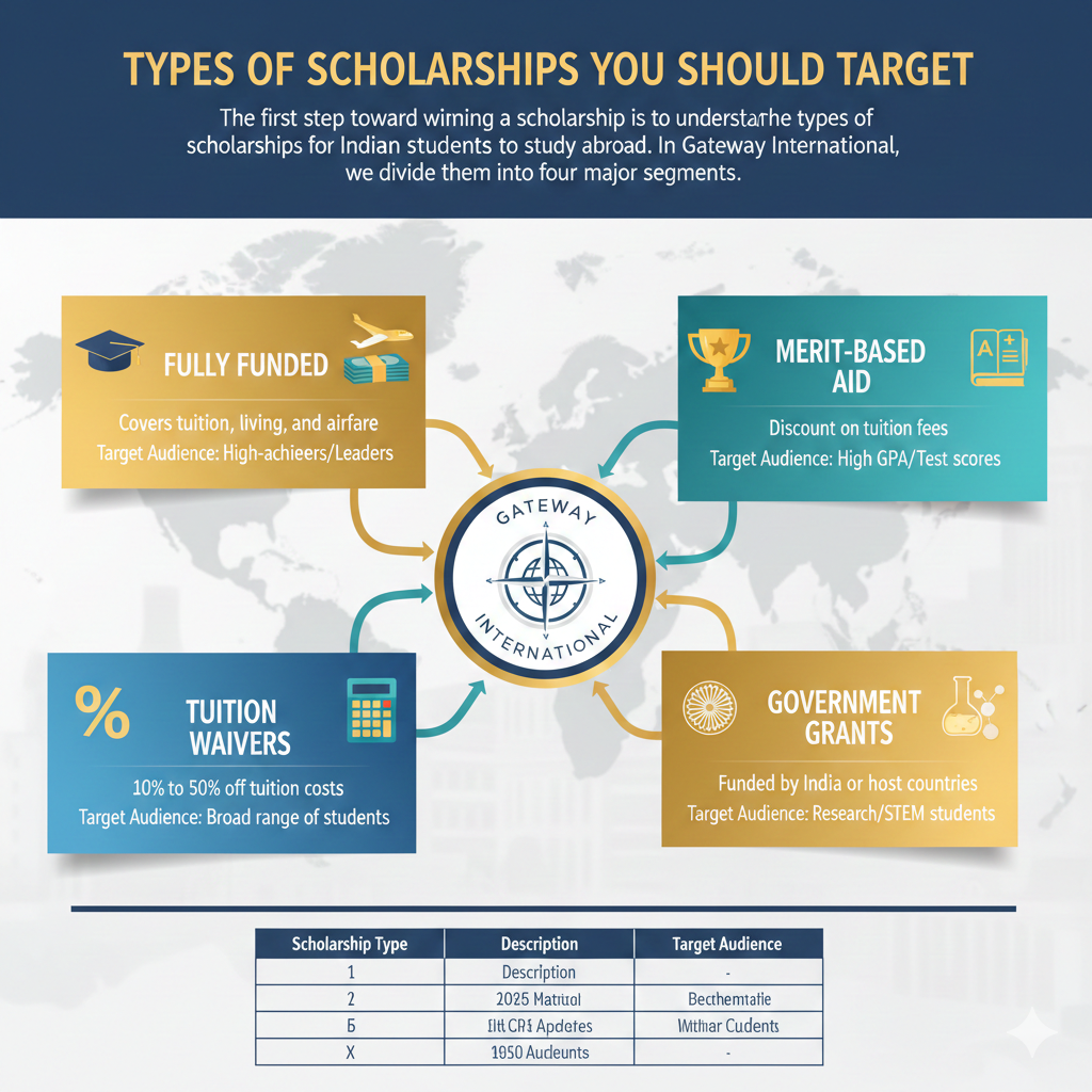 The first step toward winning a scholarship is to understand the types of scholarships for Indian students to study abroad. In Gateway Educonnect, we divide them into four major segments: