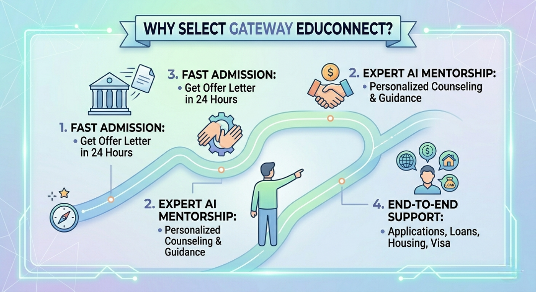 This is facilitated through professional guidance ensuring that it is an efficient process. Gateway Educonnect offers you one-on-one counselling services, expedited application and complete admission services. Apply to Gateway Educonnect now to continue your education. For more assistance please visit us study abroad consultancy, and avail of our wide range of services for students on destinations like study in USA, study in UK, study in Canada, study in Australia, study in ireland and many more country.