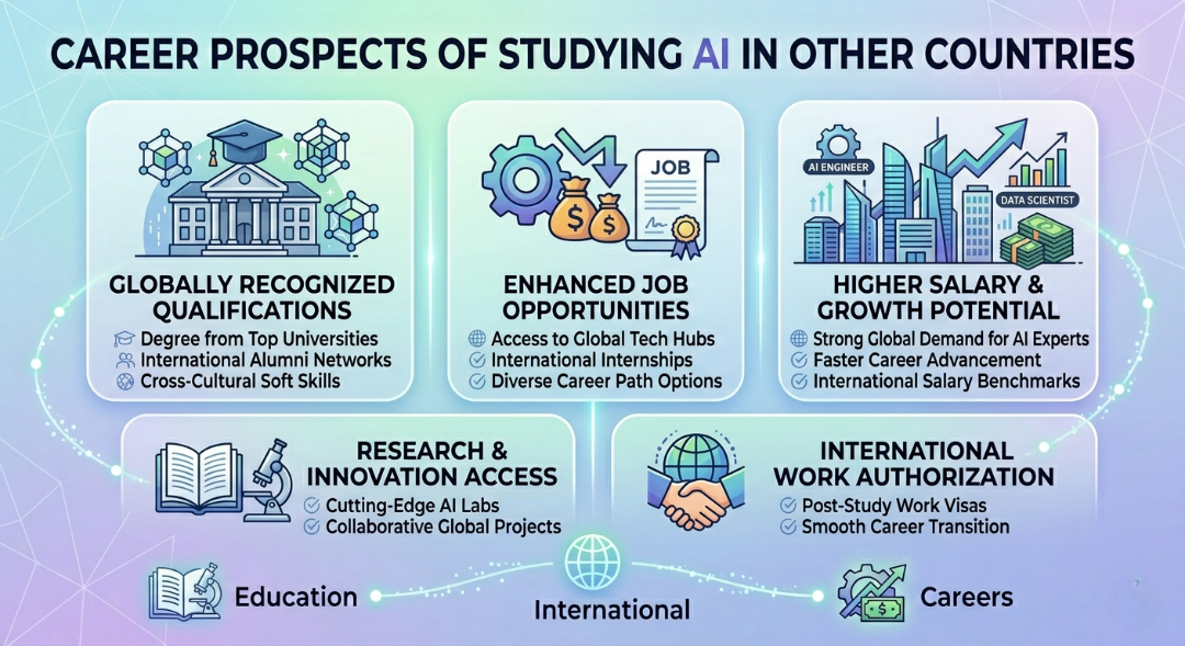 - Studying abroad at international universities provides specialised artificial intelligence courses with practicums and research.